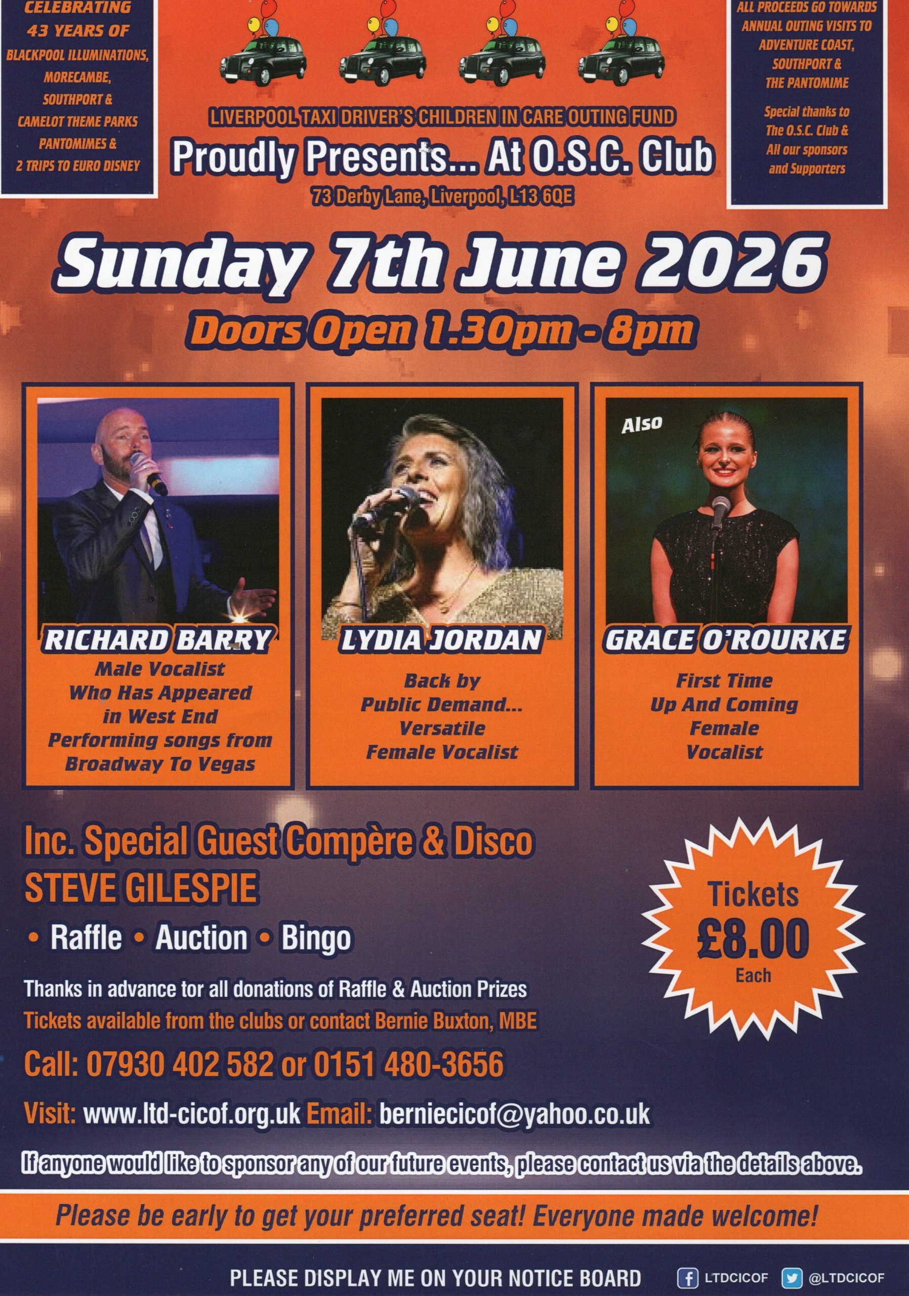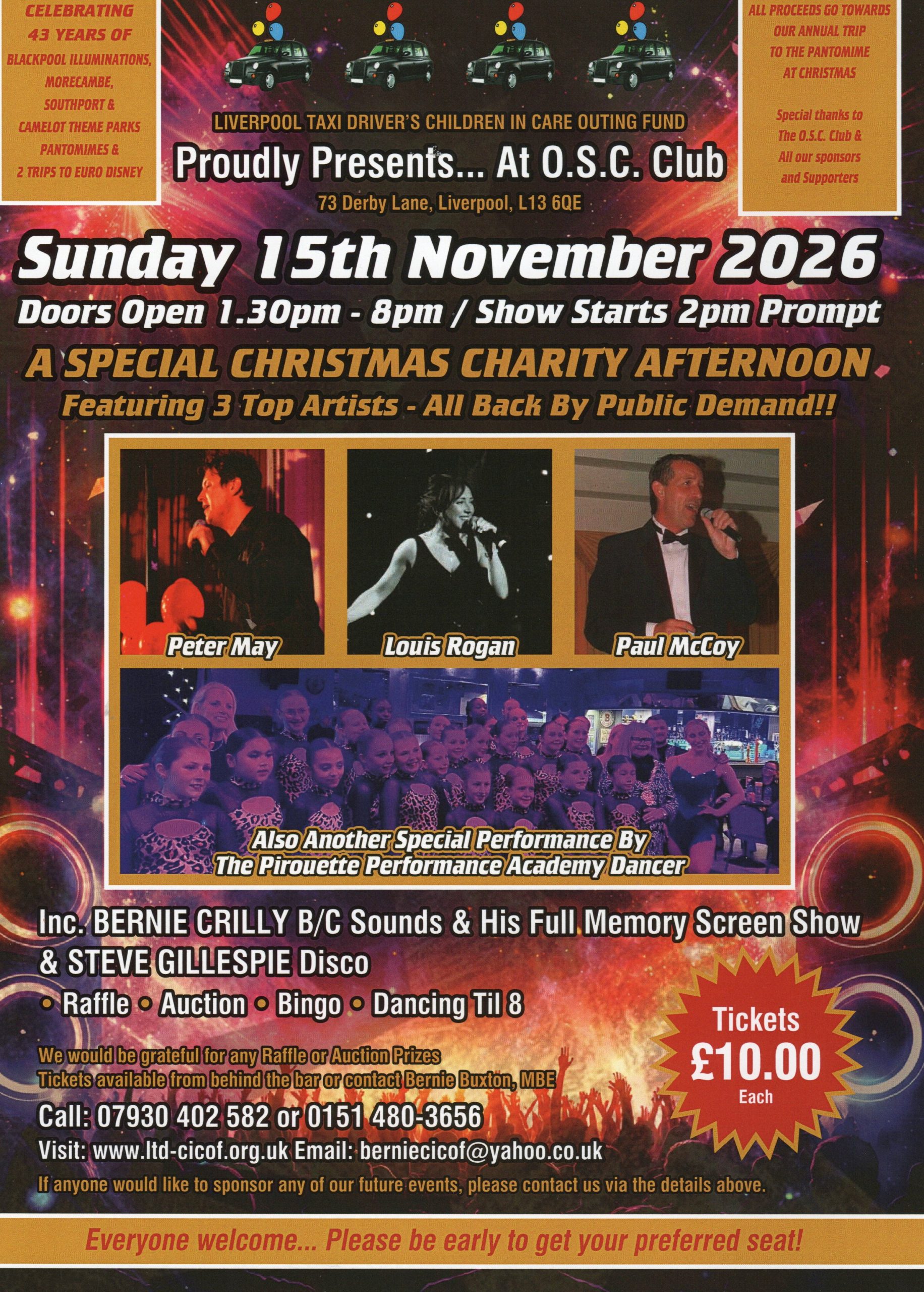 Join us for a special charity event supporting Liverpool Taxi Drivers Children in Care. All proceeds raised will help fund their annual trips to Southport Pleasure land and a festive pantomime visit, creating fun and memorable experiences for the children.